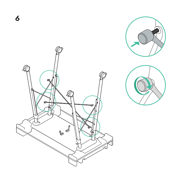 - Opakujte pro druhou sadu příčníků: vyjměte pěnu z palcových šroubů a pomocí palcových šroubů připevněte příčníky k zadním nohám.