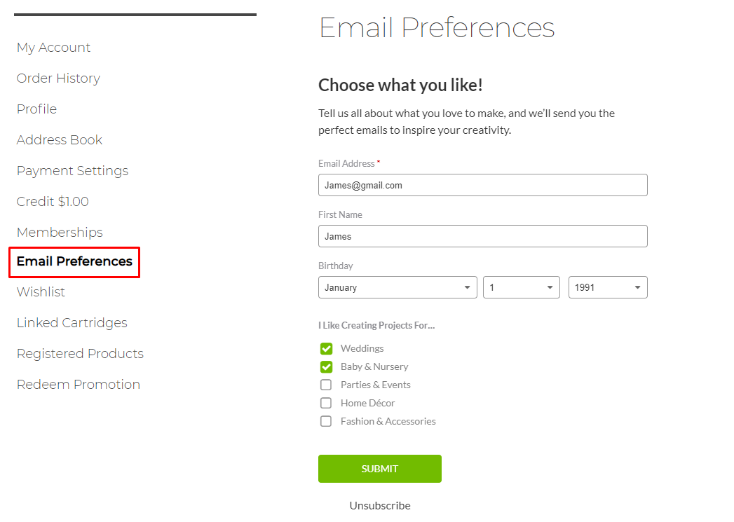 Du kan abonnere på eller framelde dig Cricuts nyhedsbreve og salgsfremmende e-mails via din cricut.com-konto ved at følge nedenstående trin: