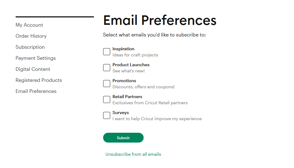 You can subscribe to or unsubscribe from Cricut newsletters and promotional emails through your cricut.com account by following the steps below: