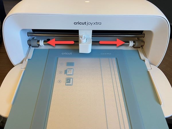 Sur la Cricut Joy Xtra, pour éviter les traces sur vos cartes, déplacez les roues en étoile de la machine sur les côtés du rail, en vous assurant qu'elles ne rouleront pas sur le dessus de la carte.