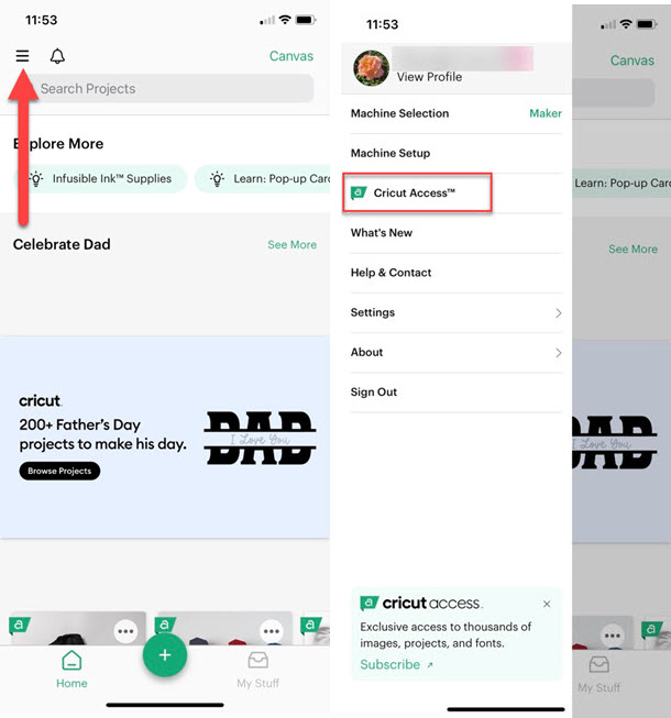 - Válaszd a Design Space menüjét, majd a Cricut Access lehetőséget.