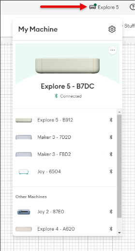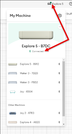 選択します(マシンのBluetooth IDはマシンの下部に印刷されています)。 IDはマシンモデル名で、4文字の英数字IDが続きます(例: Explore 5 – B 7 DC )。 - Design Spaceはマシンと接続し、マシンピッカーには「接続済み」と表示され、マシンピッカーアイコンのドットが緑色になり、マシンをカットする準備ができていることを示します。