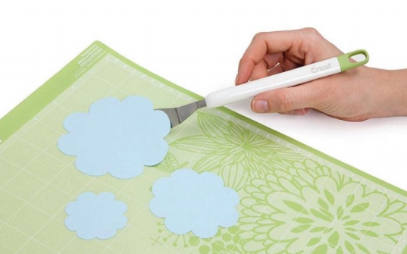 Cricut 스파츌라는 Cricut 자르기 매트에서 이미지를 정확하게 들어올려 복잡한 이미지가 찢어지거나 구부러지지 않게 합니다. 스파츌라의 기울어진 끝부분을 사용하면 재료 아래에 손쉽게 밀어 넣을 수 있습니다.