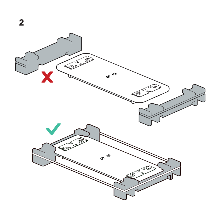 - Włóż zaczepy do otworów na zaczepy w górnej części stojaka. Znajdziesz je w rogu opakowania na blat stoiska.