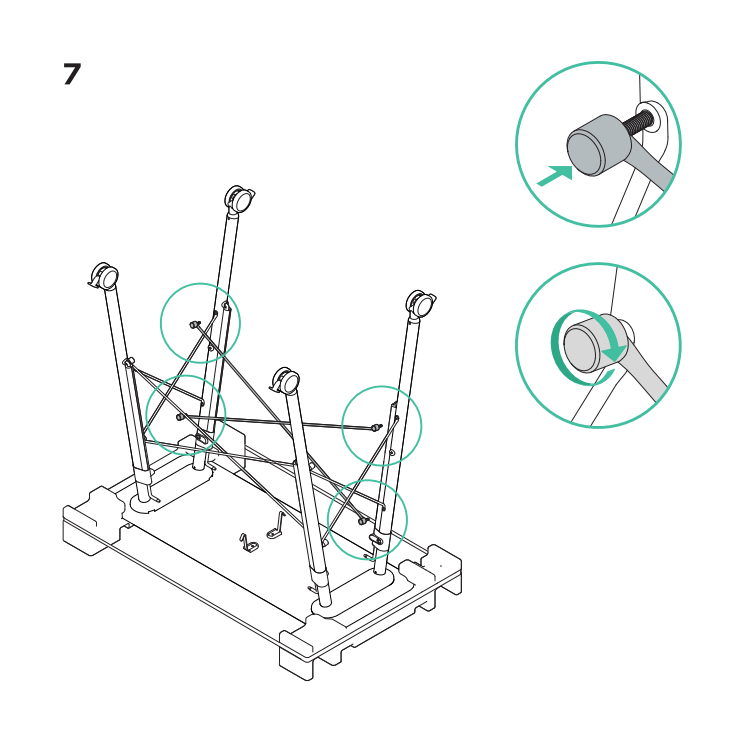 - Повторите для второго набора ригелей: удалите пену с винтов с накатанной головкой и с помощью винтов с накатанной головкой прикрепите ригели к задним ножкам.