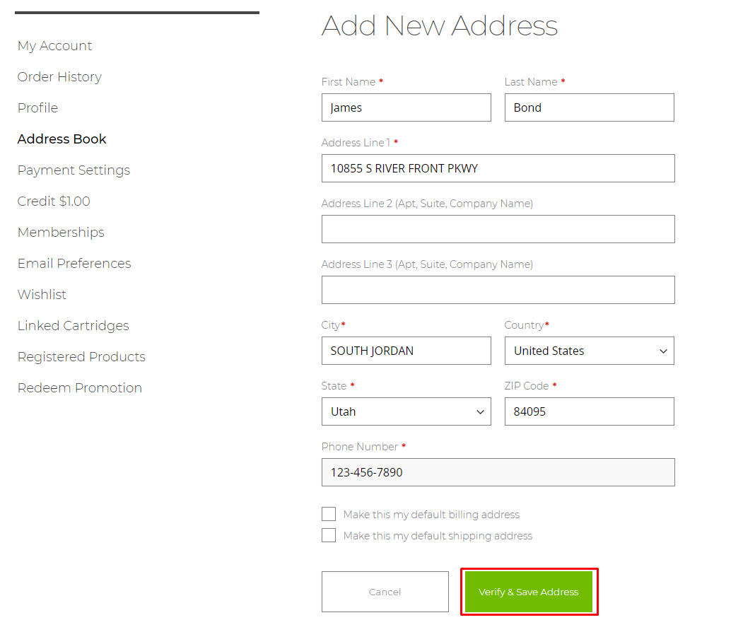 เคล็ดลับ: ในขณะที่บันทึกที่อยู่ใหม่คุณสามารถทำเครื่องหมายเป็นที่อยู่จัดส่งและ/หรือที่อยู่เรียกเก็บเงินเริ่มต้นของคุณได้